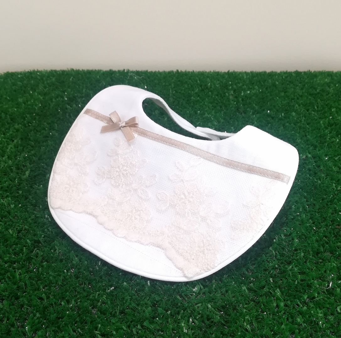 Babete de batismo com renda decorativa e fita de cetim.