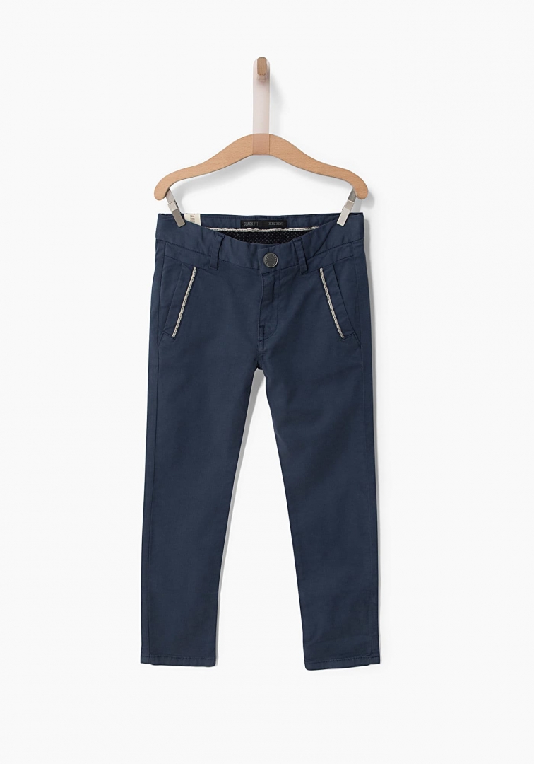 Calça para menino de corte chino. n nModelo em sarja, de três bolsos de corte á faca. n nAzul marinho slim.