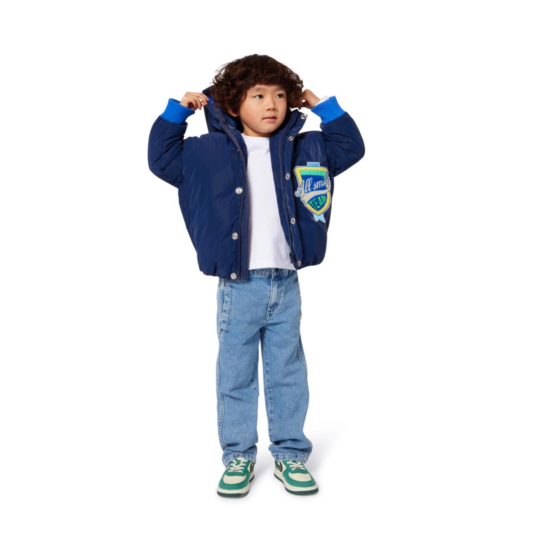 Calça jeans, 4 bolsos, cós ajustável, braguilha com zíper, cortes nas laterais, emblema decorativo nas costas, etiqueta. Caimento regular.