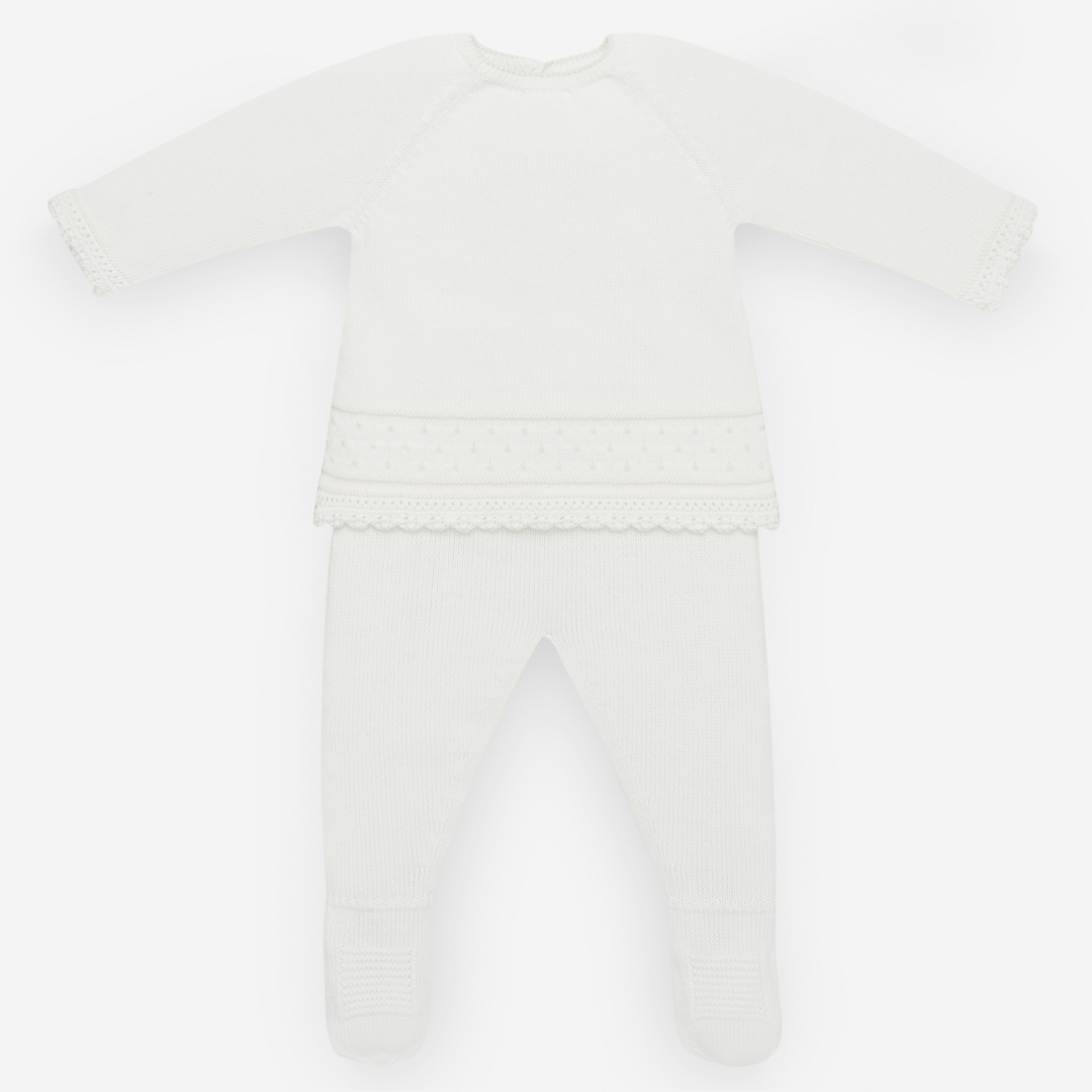 Conjunto constituido por três peças: calça com pé, camisola e touca.