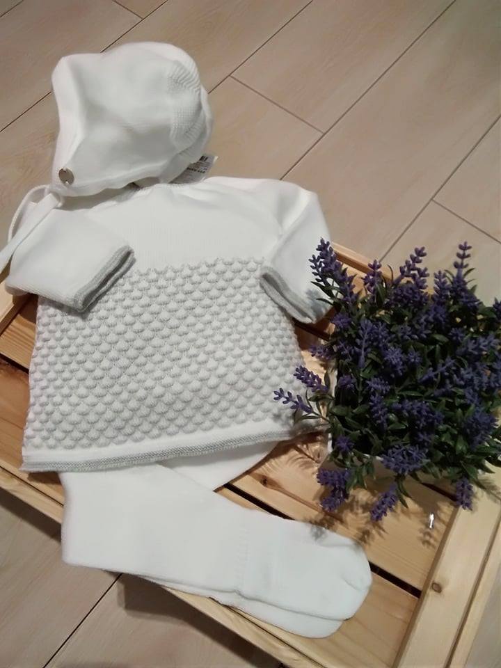 Conjunto constituido por três peças: calça com pé, camisola e touca.