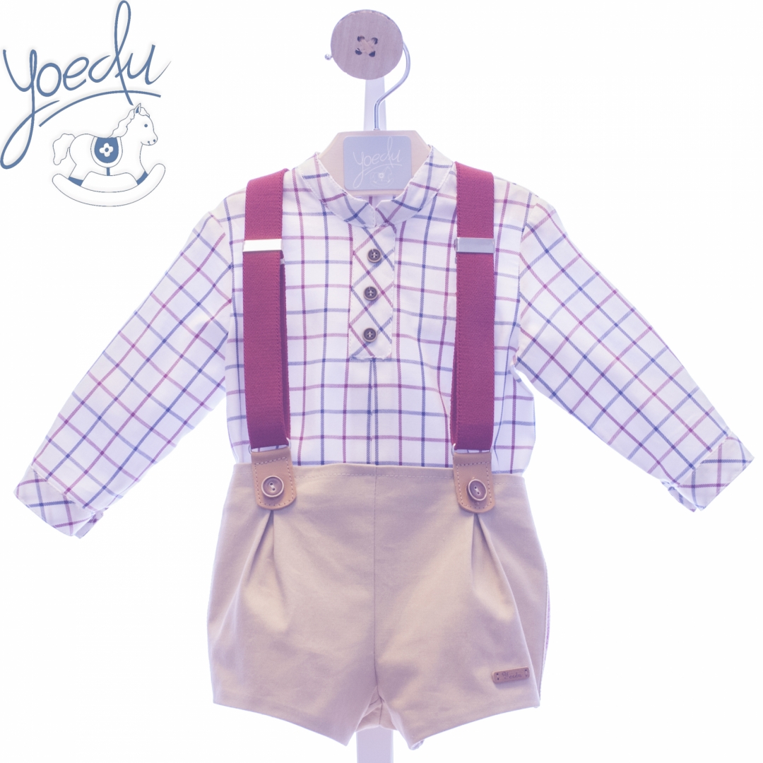 Conjunto para menino composto por camisa e calção com suspensórios.