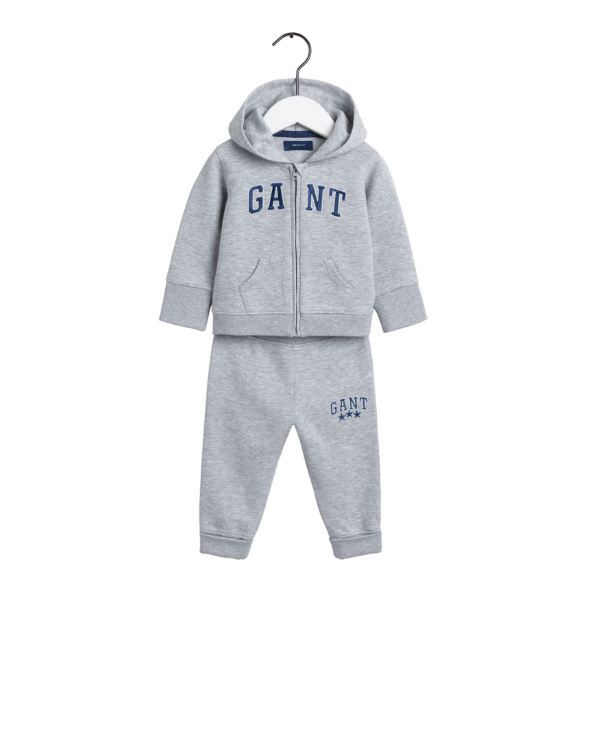 TO conjunto GANT Varsity Baby Boy apresenta um casaco desportivo com capuz e fecho integral com a inscrição GANT bordada em grande escala e calças desportivas a combinar com um bordado na coxa.