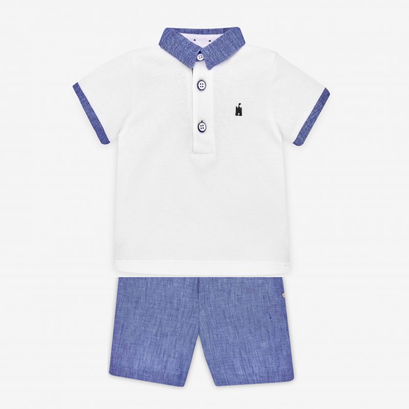 Conjunto para menino, composto por polo e calção. n nPolo com contraste de cor e tecido em linho. Gola e remate das mangas em azul mar. n nAperta com botões frontais. n nCalção em linho no mesmo tom dos detalhes do polo. n nDisponível desde 18 meses até 48 meses. n nComposição: n nPólo: 100% Algodão. n nCalção. 100% Linho.