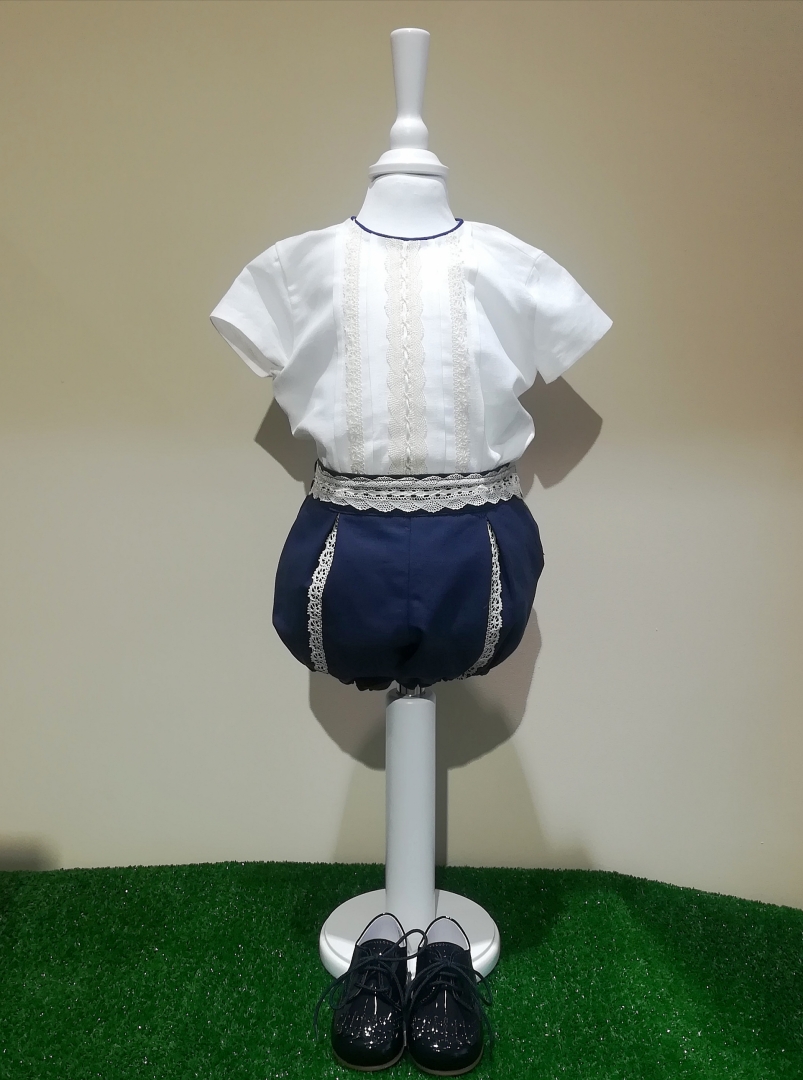 nCamisa em linho sem gola com debroado a azul marinho, de manga curta.