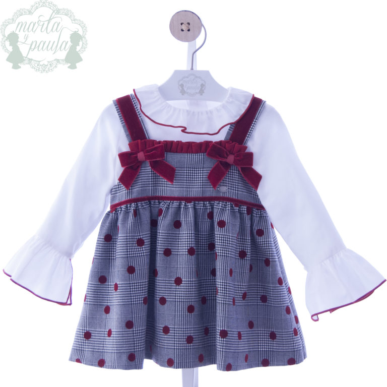Conjunto composto por saia de peito com padrão de tartan e bolinhas, com blusa branca.