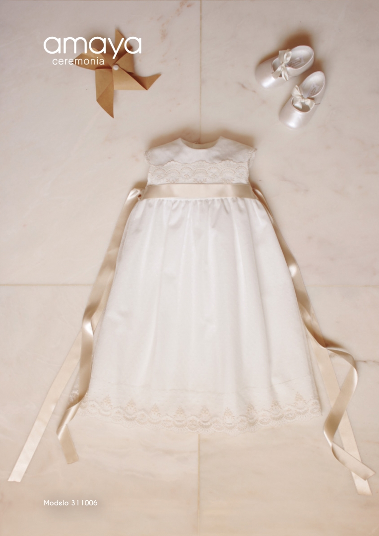 Vestido de batizado comprido, com corte princesa.