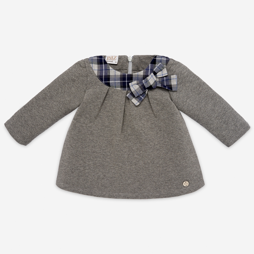 Vestido para bebé a direito, com apontamento de xadrez na gola.
