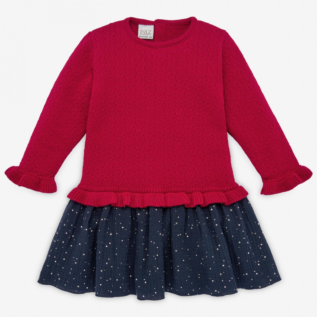 Vestido menina Paz Rodriguez em malha de espiga e decote redondo, detalhe nos punhos e em baixo, combinado com tela azul marinho com pontos dourados.