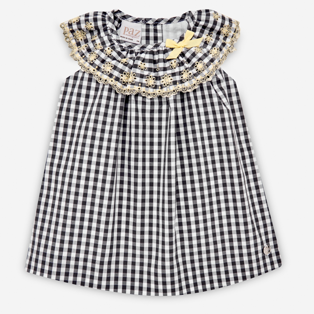Vestido solto para bebé, com padrão em xadrez. n nModelo sem manga e com grande folho no decote. n nBordado inglês em cor contraste no folho. n nComposição: n n100% Algodão